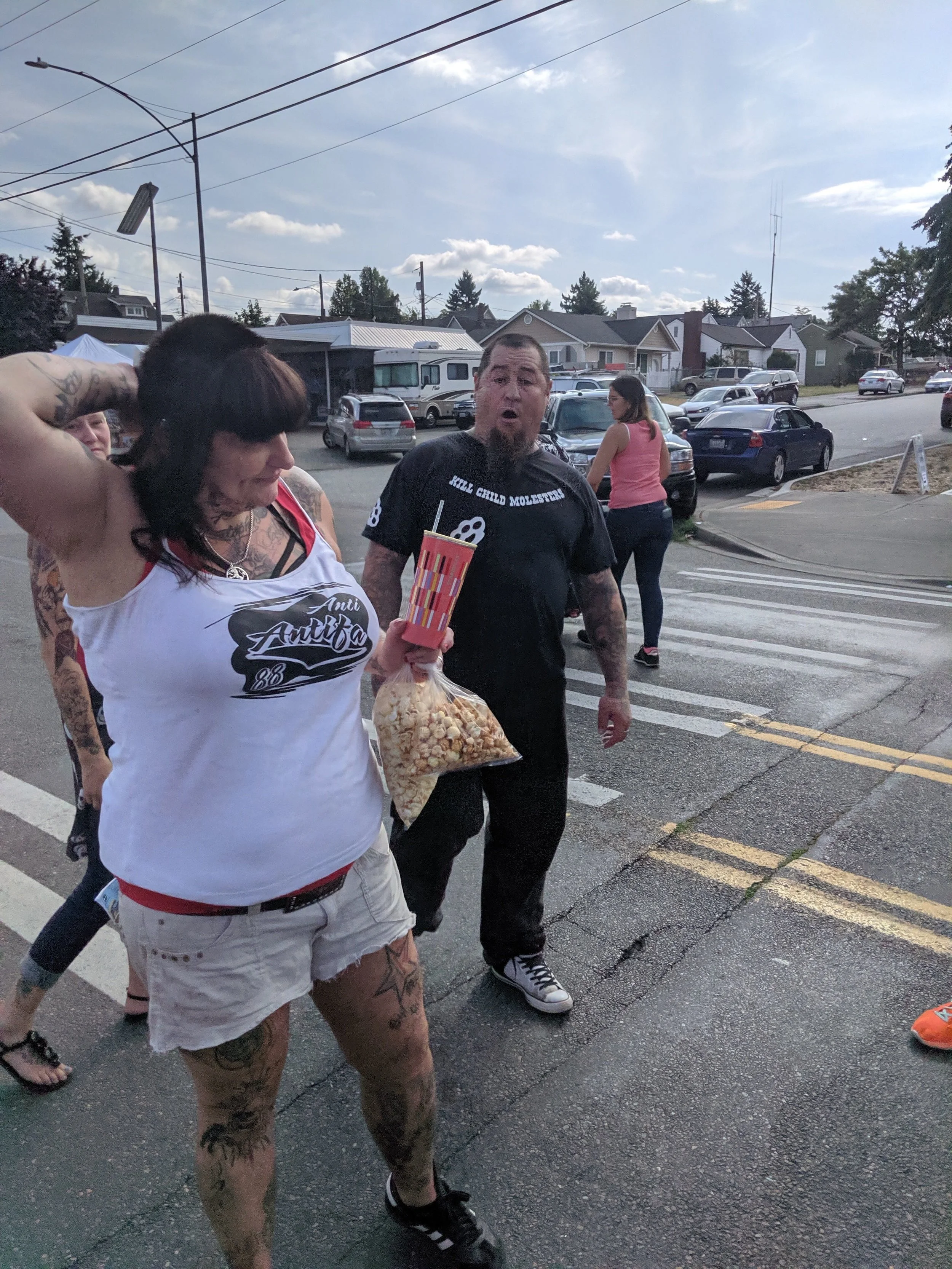 Late in the day, a group of the very white supremacists TAN has been working against (Gravy and Ryan Desimas, Brady, Kenrick Baughman, and Gravy’s girlfriend Genevieve) approached our table. They yelled, postured, threatened TAN volunteers and damaged, defaced and removed our materials.